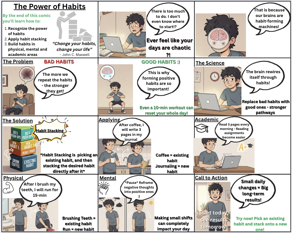 • When I was reading the criteria for this educational comic, I knew I wanted to do something that would relate to the same demographic that I am in. I was brainstorming and started reflecting on how small habits in my life make a large impact long-term because of how busy I am in my day-to-day life. I then started thinking about habit-stacking and how learning these two years ago has positively impacted my life. I knew then that I wanted to make an educational comic on the power of our habits and highlight habit stacking in the comic as well. I used Gemini 2.5 to help create my images and gave it a very specific prompt.