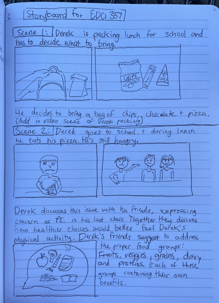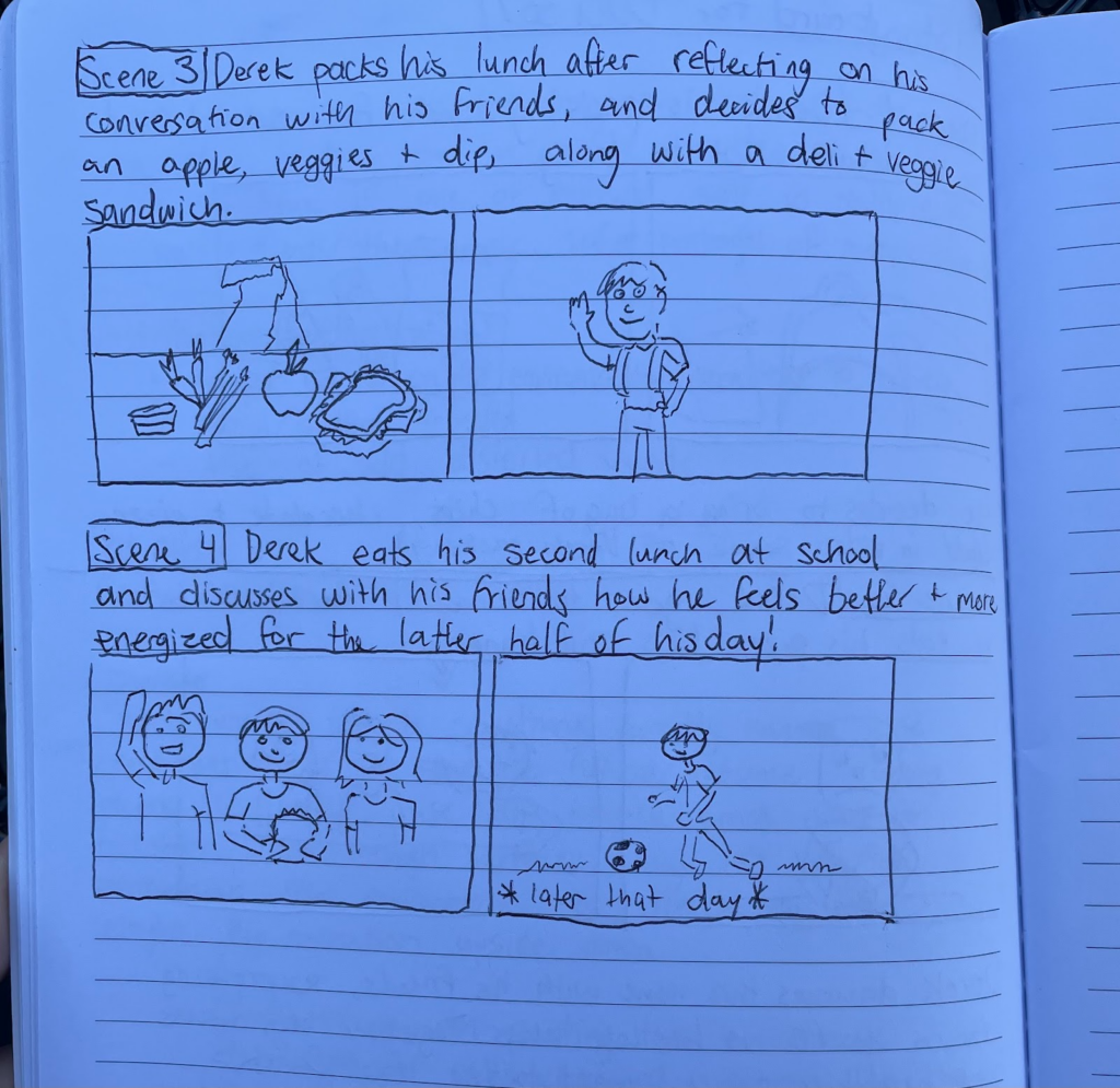 Scene 2: Derek goes to school and eats their lunch in the cafeteria, afterwards feeling sick and unfulfilled. This makes his PE class a lot more challenging throughout the day. They discuss with their friends how they’re feeling, and their friends suggest that tomorrow they pack a more substantial lunch with healthier choices.